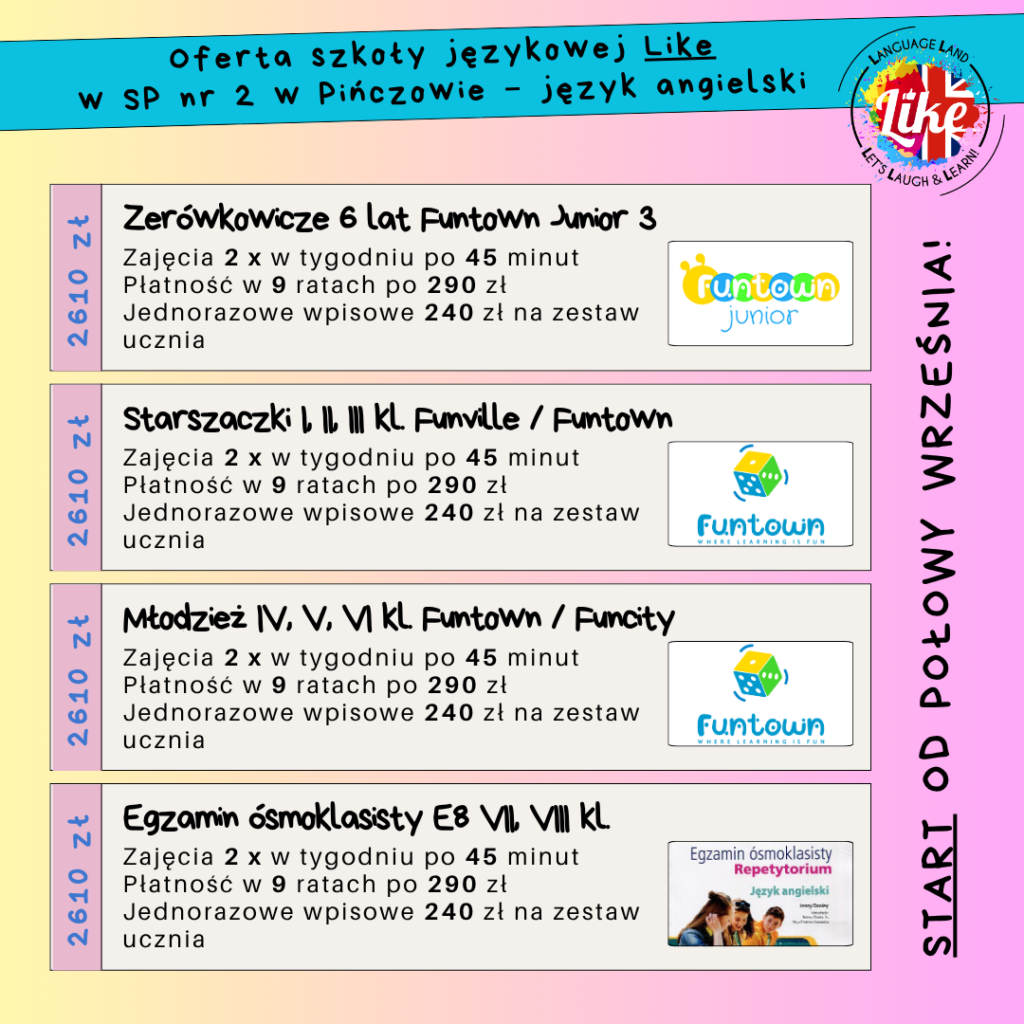 Ruszyły zapisy do szkoły językowej LIKE na kolejny rok szkolny w Kijach i Pińczowie w szkole nr 2! 😇